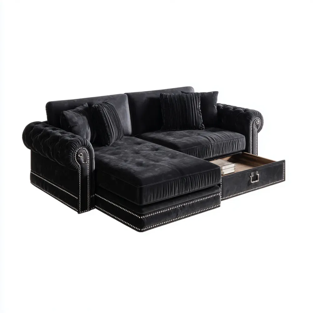 Présentation du produitDécouvrez ce canapé d'angle en velours Noir, une pièce élégante qui apporte à la fois confort et style à votre espace de vie.